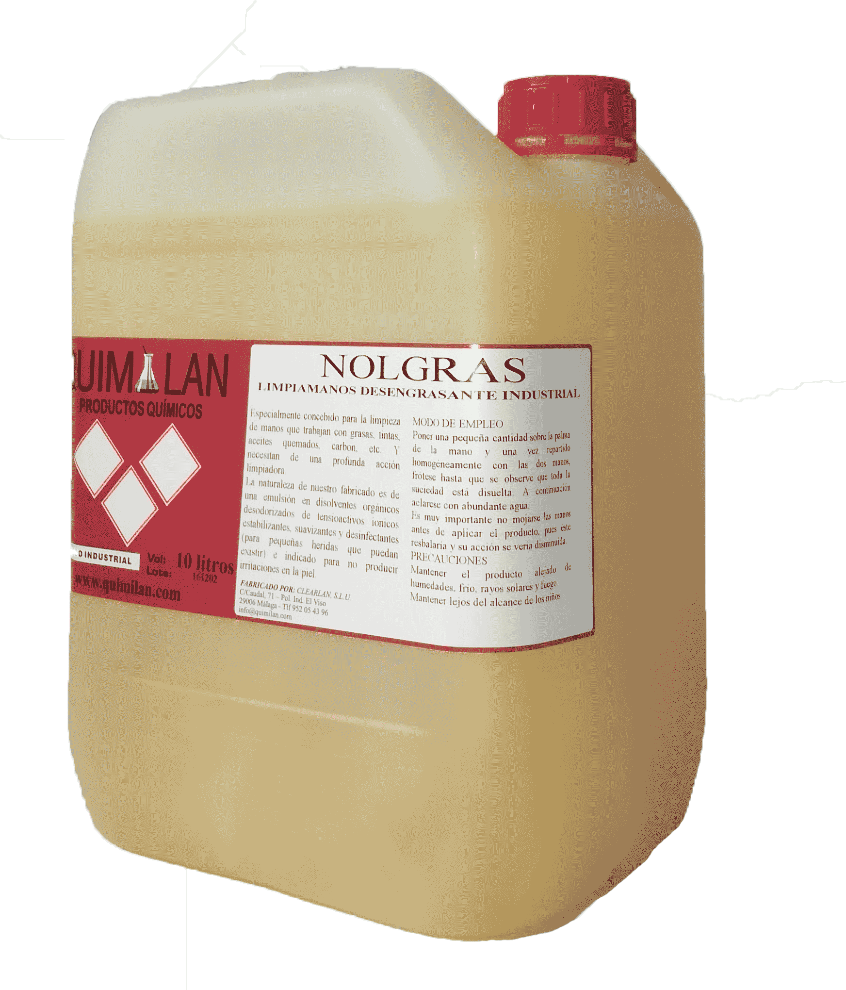 Especialmente concebido para la limpieza de manos que trabajan con grasas, tintas, aceites quemados, carbón, etc. Y necesitan de una profunda acción limpiadora. La naturaleza de nuestro fabricado es de una emulsión en disolventes orgánicos desodorizados de tensioactivos ionicos estabilizantes, suavizantes y desinfectantes (para pequeñas heridas que puedan existir) e indicado para no producir irritaciones en la piel.