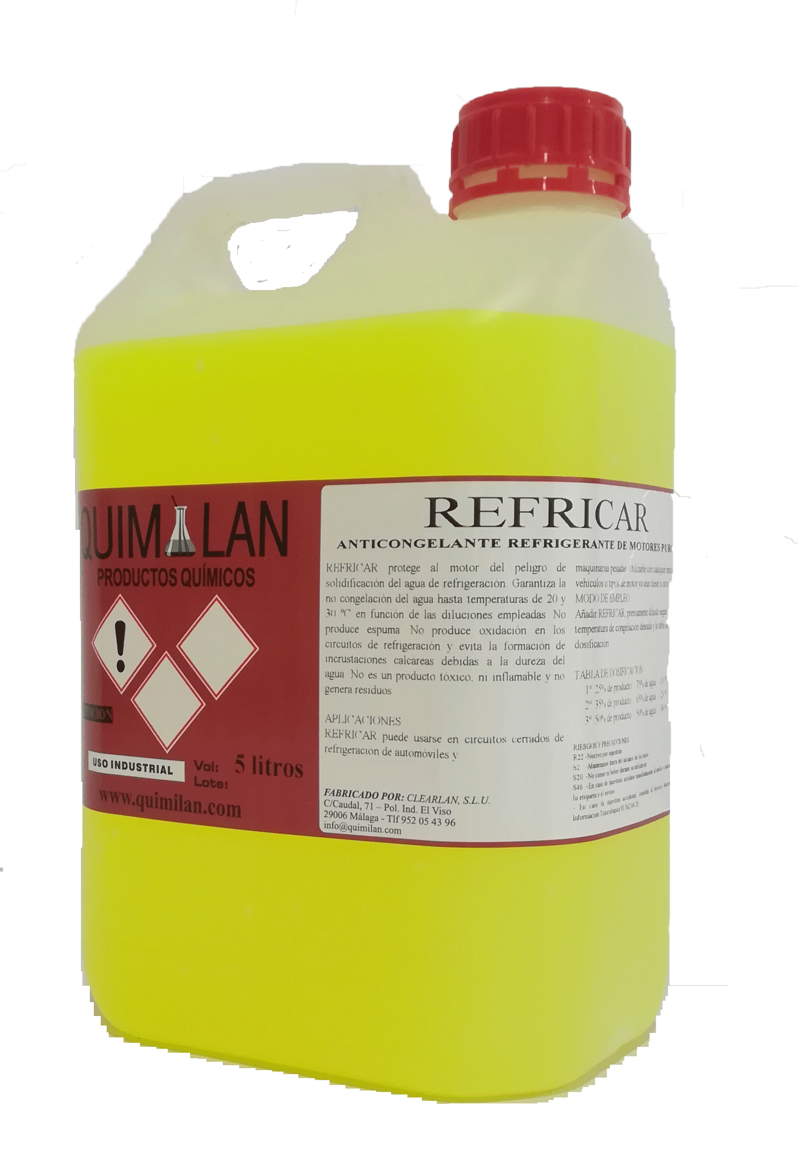 Protege al motor del peligro de solidificación del agua de refrigeración. Garantiza la no congelación del agua hasta temperaturas de 20 y 30 ºC en función de las diluciones empleadas. No produce espuma. No produce oxidación en los circuitos de refrigeración y evita la formación de incrustaciones calcáreas debidas a la dureza del agua. No es un producto tóxico, ni inflamable y no genera residuos. Puede usarse en circuitos cerrados de refrigeración de automóviles y maquinarias pesadas. Utilizable con cualquier marca de vehículos o tipos de motor ya sean diesel u otros.